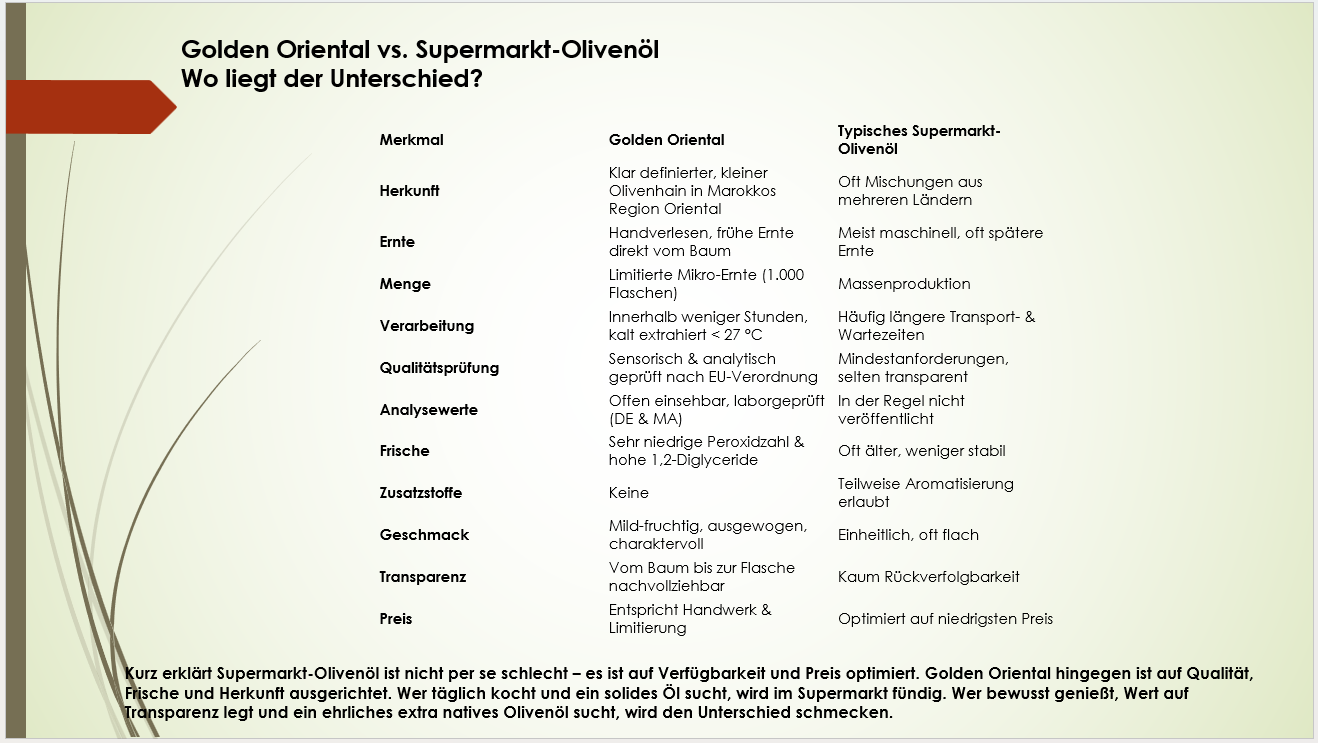 Golden Oriental ist ein ehrliches, extra natives Olivenöl für Menschen, die Wert auf Transparenz, Handwerk und geprüfte Qualität legen.